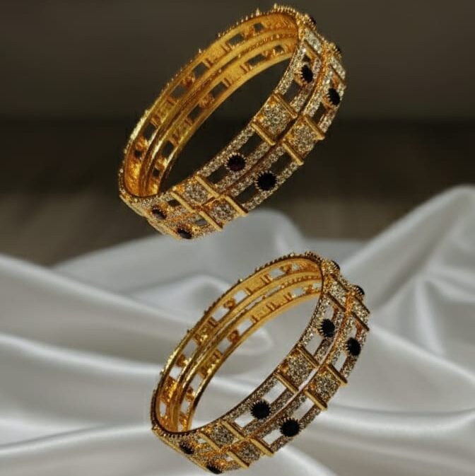 Embellishments: Each bangle is lavishly studded with bright, clear/white stones (likely cubic zirconia or high-quality rhinestones) that catch the light beautifully.