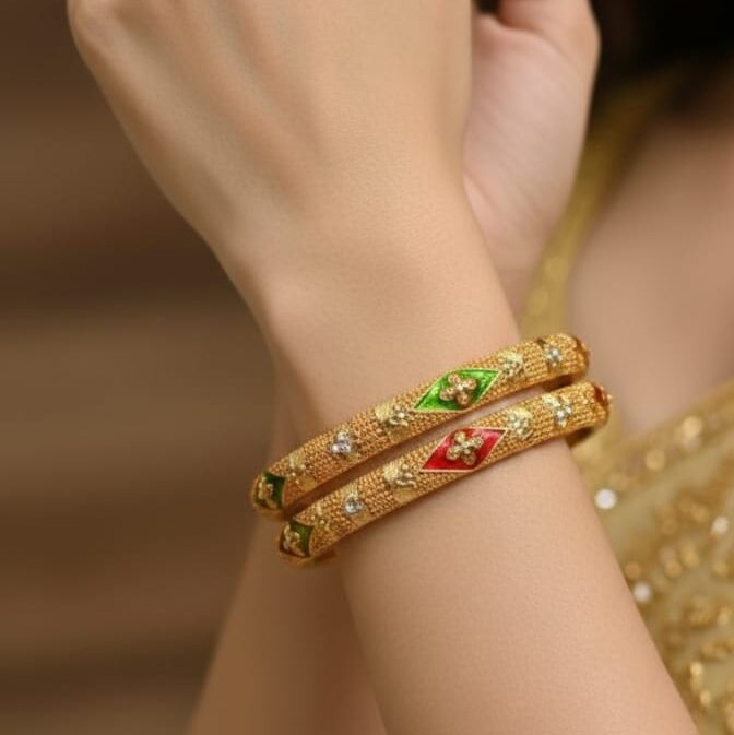 This stunning pair of bangles showcases a classic and intricate design, perfect for adding a touch of traditional elegance to any occasion. Crafted with a delicate filigree pattern in a rich gold-plated finish, these bangles are elevated by vibrant Meenakari (enamel) work, making them a captivating accessory.