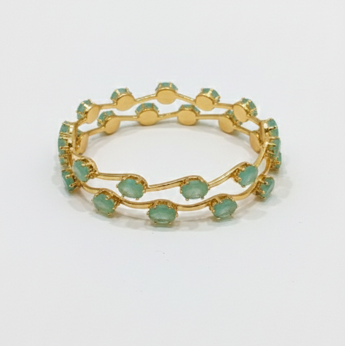 Adorn your wrist with this stunning set of two designer bangles, featuring a captivating array of oval/emerald-cut stones in a delicate shade of seafoam green or light aqua. Each bangle is meticulously crafted with a sleek, gold-plated band that gracefully encircles the wrist, with the stones set along the circumference to create a mesmerizing, continuous sparkle. Perfect for adding a touch of traditional elegance to any festive or formal ensemble.