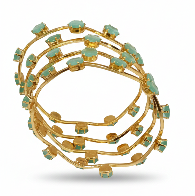 Elegant gold-toned bangles featuring a row of oval light green stones.