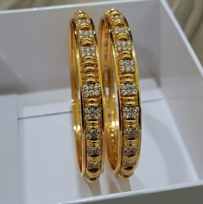 Adorn your wrist with these stunning, traditional gold bangles, meticulously crafted for a look of timeless elegance and opulence. Each bangle features a beautifully textured gold surface, punctuated by multiple bands of brilliant, dazzling diamond-style stones.