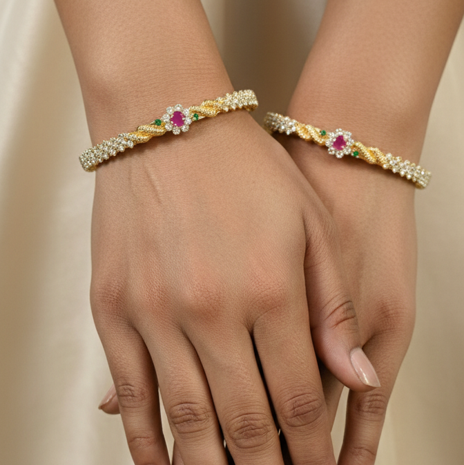 Gemstone Embellishment: The focal point of each bangle is a beautiful, floral-inspired motif at the center, meticulously set with a striking ruby-red stone surrounded by smaller emerald-green and clear white AD stones.