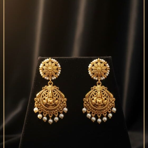 Design: Features classic Goddess Lakshmi motifs (Temple work) symbolizing prosperity, accented with delicate white pearl droplets.